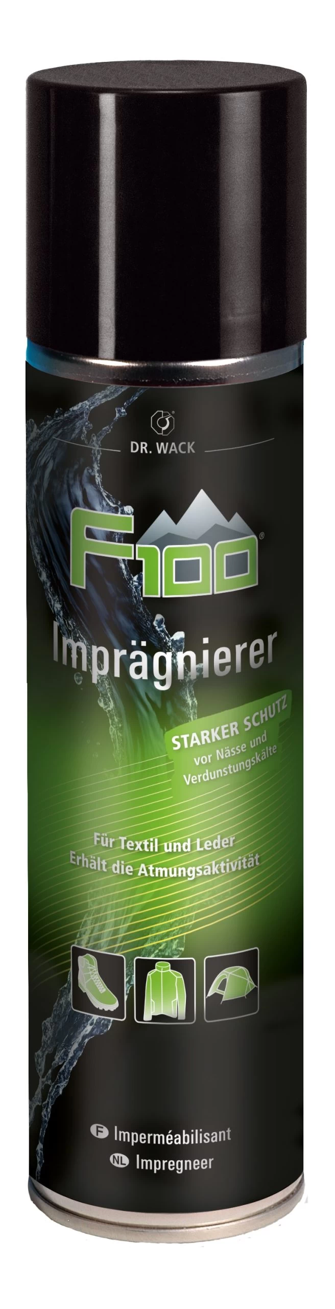 – Der F100 Imprägnierer erhält die Atmungsaktivität von Klimamembranen wie z.B. GoreTex®, Sympatex ® (lt. Gutachten) und schützt durch eine lang andauernde Imprägnierung gegen Wasser, Öl und Schmutz.