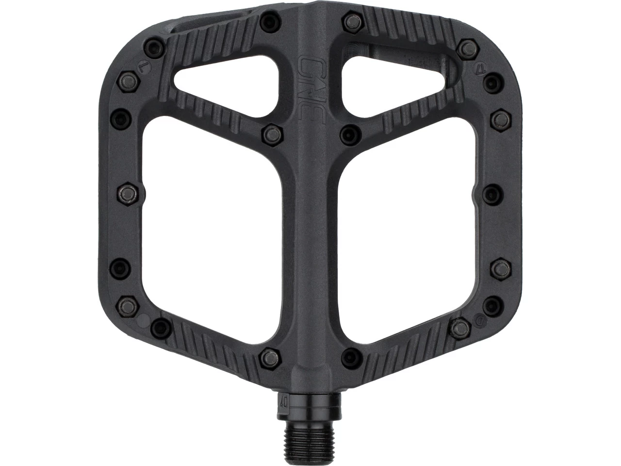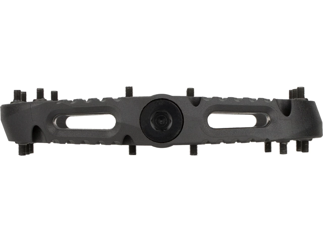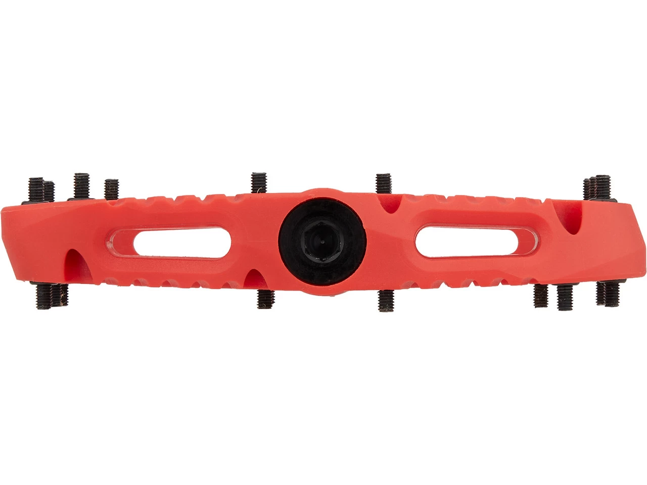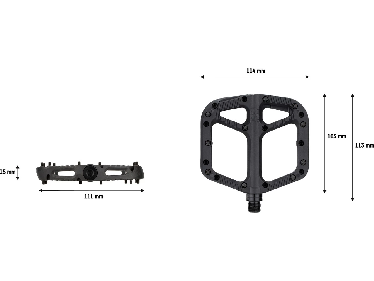 Spezifikationen:Einsatzbereich:All Mountain, Enduro, DownhillAusführung:PlattformpedaleTechnische Daten:Material Pedalkörper:Kunststoff (Nylon Komposit)Material Achse:Stahl (CrMo)Lagerung:DU, IndustrielagerBauhöhe:13,3 – 18,5 mmMaße (Länge x Breite):115 mm x 105 mm*Anzahl Pins pro Pedal:20