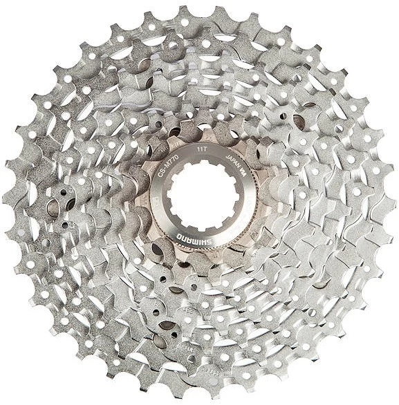 Spezifikationen:Einsatzbereich:Cross Country, Touring & TrekkingSchaltstufen:9-fachAbstufungen:11-32, 11-34Material Ritzel:StahlFreilaufkompatibilität:Shimano MTBHinweis:mit 1,85 mm Distanzring kompatibel zu Shimano Road 11-/12-fachTechnische Daten:Serie:Deore XT M770Spider / Ritzelträger:1 (Aluminium)Empfohlene Kette:HG (bspw. CN-HG93)Features:optimierte SteifigkeitAlu-Träger für 5 große Kränze (11-32 Z) oder 6 große Kränze (11-34 Z)leichtChrom-Finish (gestrahlt)Technologie:HG-Kassette