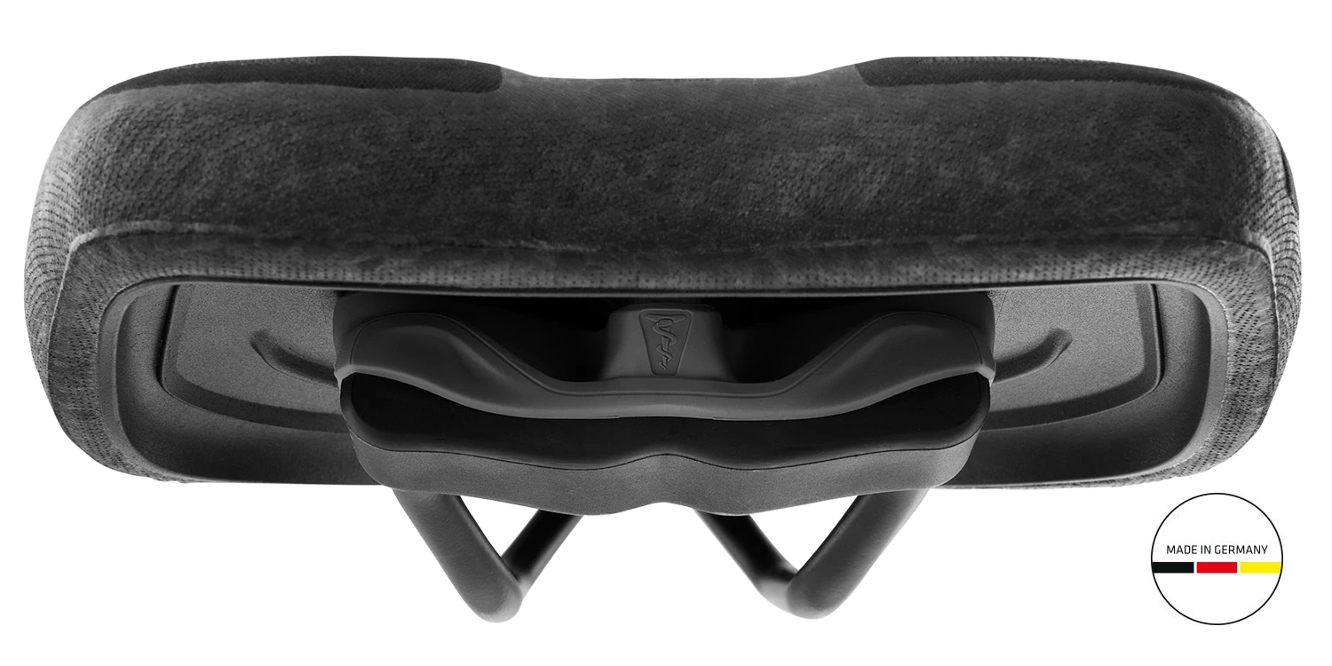 Auch die im Niveau tieferliegende, flache, leicht gewölbte Sattelnase sorgt für weniger Druck auf den empfindlichen Stellen bei Mann und Frau gleichermaßen. Für noch bessere Druckentlastung, gerade bei längeren Anstiegen im Gelände, wurde die Sattelnase breit, mit einer flachen und möglichst großen Auflagefläche konzipiert.