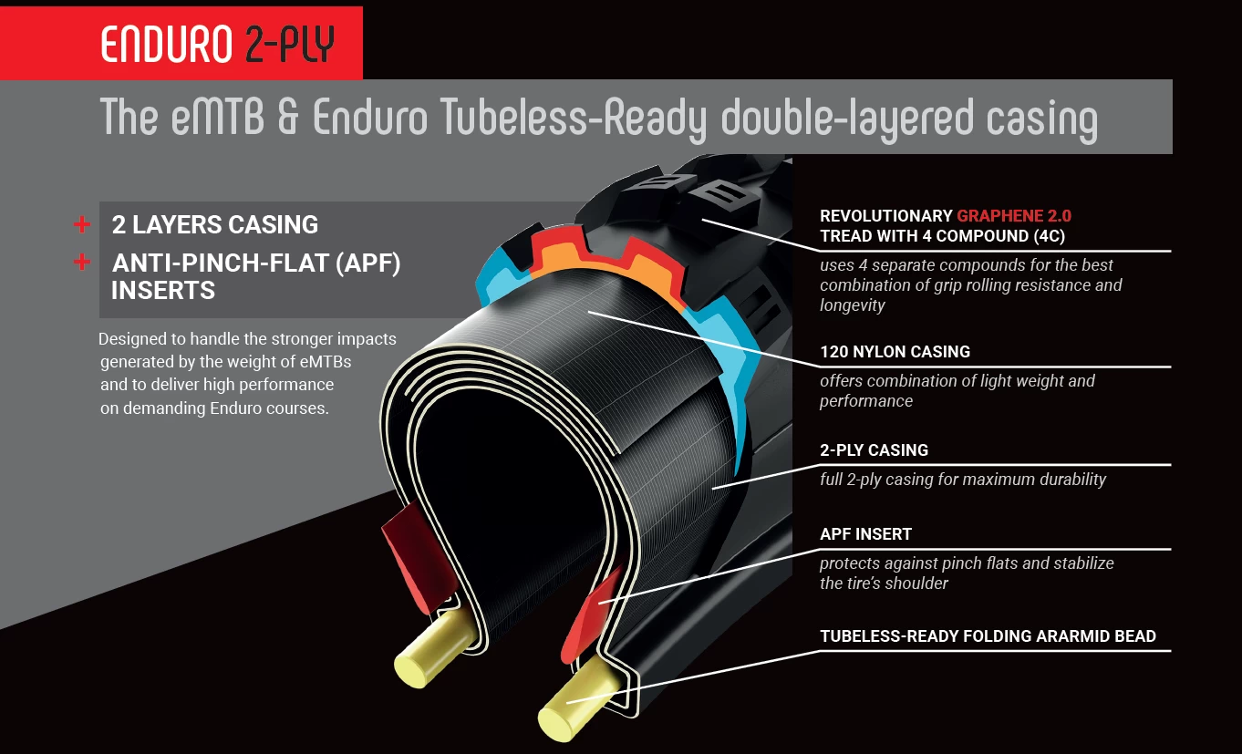 Dieses Casing ist entwickelt worden, um die stärkeren Auswirkungen des Gewichts von eMTBs zu bewältigen und bei anspruchsvollen Enduro-Kursen eine hohe Leistung zu erbringen. Dabei bietet die TLR-Konstruktion von Vittoria ultimativen Pannenschutz an den Seitenwänden. Für besonders hohe Langlebigkeit und Stabilität sorgt die Doppelschicht des extra leicht gewählten Nylon-Casings.